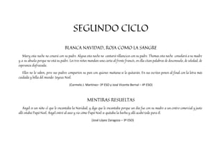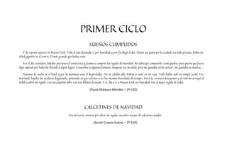 El documento narra diversas experiencias relacionadas con la Navidad, destacando un sueño de viajar a Nueva York y la emoción de recibir billetes de avión como regalo. También se presentan relatos de niños que enfrentan la soledad en estas fechas. Además, se mencionan interacciones en redes sociales sobre un concurso de microrrelatos en una escuela.