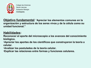El documento resume la historia de la teoría celular, desde los primeros avistamientos de células usando microscopios hasta la formulación de los postulados celulares por Schleiden y Schwann en el siglo XIX. Explica que las células fueron las primeras estructuras observadas en los tejidos vivientes y que la teoría celular establece que la célula es la unidad básica estructural y funcional de todos los organismos vivientes.