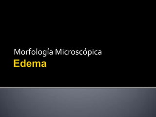 El documento describe las características microscópicas de la morfología en diferentes órganos y tejidos. Se observa aclaramiento intracelular y edema celular leve en tejido subcutáneo, pulmón y encéfalo. En el hígado se ven áreas centrales rojas y deprimidas rodeadas de parénquima marrón, formando un patrón de "hígado en nuez moscada". En pulmón el intersticio está ensanchado con aumento de células y desproporción entre leucocitos intersticiales
