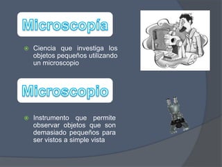 La microscopía es la ciencia que estudia objetos demasiado pequeños para ser vistos a simple vista utilizando un microscopio. Existen diversos tipos de microscopios como los ópticos, estereoscópicos, de campo claro, campo oscuro, contraste de fases, fluorescencia, polarización, confocal y electrónicos que permiten observar detalles a escalas micro y nanométricas.