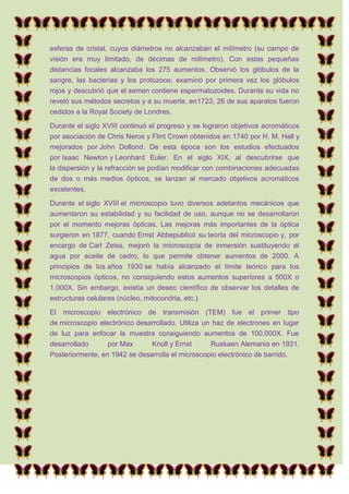 El microscopio es un instrumento que permite observar objetos demasiado pequeños para ser vistos a simple vista utilizando lentes que producen imágenes aumentadas. El microscopio óptico, el primero en ser inventado, usa lentes para obtener imágenes aumentadas mediante la refracción de la luz. A lo largo de los siglos, científicos como Anton van Leeuwenhoek y Robert Hooke mejoraron el microscopio óptico y realizaron importantes descubrimientos biológicos, mientras que en el siglo XX se desarroll