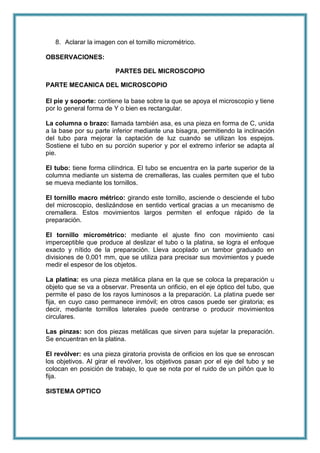 El documento describe las partes y el uso correcto de un microscopio. Explica que el microscopio consta de una base, columna, tubo, tornillos macro y micrométricos, platina, pinzas y objetivos. Los objetivos aumentan la imagen y se colocan en un revólver giratorio. El microscopio también incluye un sistema de iluminación con fuente de luz, espejo, diafragma y condensador. El documento provee instrucciones para el uso adecuado del microscopio y no dañar sus componentes.
