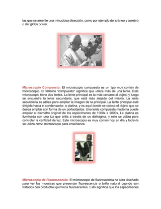 El documento describe diferentes tipos de microscopios, incluyendo microscopios estereoscópicos, quirúrgicos, compuestos, de fluorescencia, electrónicos de transmisión, confocales, de campo oscuro, de contraste de fase y de luz polarizada. Cada microscopio se utiliza para un propósito específico como la observación de muestras grandes sin preparación, microcirugía, enseñanza, fluorescencia y detección de componentes a nivel atómico y molecular.
