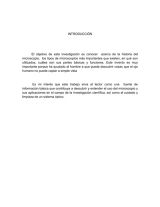 El documento describe la historia del microscopio, los diferentes tipos como el microscopio óptico, electrónico y sus variantes, sus usos en la investigación científica y medicina, así como los procedimientos básicos de limpieza y mantenimiento. El microscopio ha permitido descubrir el mundo microscópico y ha sido fundamental en campos como la biología celular.