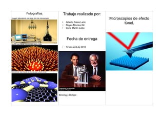 El documento describe la historia y funcionamiento del microscopio de efecto túnel. Explica que se basa en el efecto túnel cuántico para revelar la estructura atómica de las partículas con alta resolución. Fue inventado en 1981 por Binning y Rohrer, quienes ganaron el Premio Nobel por este logro. El microscopio de efecto túnel funciona aplicando una diferencia de potencial entre la punta de la aguja y la superficie para transmitir corriente a distancias menores que la longitud de onda de De