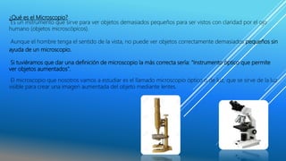 El microscopio es un instrumento óptico que permite ver objetos demasiado pequeños para ser vistos con el ojo humano. Fue inventado en el siglo XVI por fabricantes de lentes holandeses como Zaccharias Janssen y Hans Lippershey, aunque Anton van Leeuwenhoek lo perfeccionó en el siglo XVII al desarrollar lentes capaces de aumentar hasta 270 veces. Hoy en día existen microscopios ópticos, electrónicos y digitales que se utilizan en investigación científica y medicina.