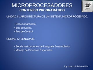 El documento presenta el contenido programático de un curso sobre microprocesadores. Se describen cinco unidades que cubren conceptos básicos, memoria y periféricos, arquitectura de sistemas microprocesados, lenguajes de programación y microcontroladores. También se resume la historia del desarrollo de los microprocesadores desde los primeros modelos de 4 bits hasta la quinta generación con procesadores como el Pentium.
