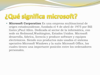 Microsoft Corporation es una empresa multinacional fundada en 1975 dedicada al desarrollo de software. Opera en tres divisiones principales y sus productos más populares son Microsoft Windows y Microsoft Office. Microsoft Office es una suite de aplicaciones que incluye programas como Word, Excel y PowerPoint y ha evolucionado a través de distintas versiones para adaptarse a los sistemas operativos de Microsoft.