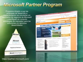 Microsoft propone un programa para que empresas de desarrollo e implementación se conviertan en socios de negocios, colaborando en estrategias de mercadeo. Además, apoya a empresas innovadoras con menos de tres años de existencia y menos de un millón de dólares en ingresos, proporcionando beneficios de costo y horas de soporte. También ofrece programas de invitación para facilitar la adopción temprana de tecnologías como Windows Mobile y Office.