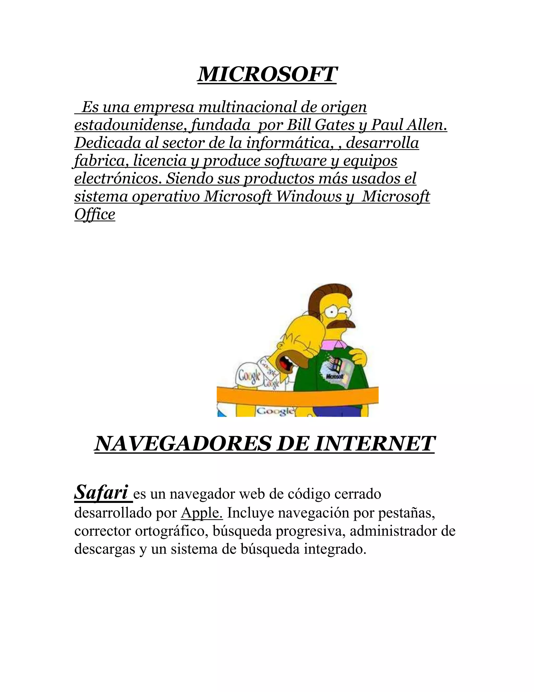 Microsoft es una empresa estadounidense fundada por Bill Gates y Paul Allen dedicada al desarrollo de software como el sistema operativo Windows y la suite Office. Los principales navegadores web son Safari de Apple, Firefox de código abierto, y Opera de la empresa noruega Opera Software. El acceso a Internet puede ser por cable, inalámbrico o satelital. El software libre permite utilizar y distribuir programas sin restricciones y con acceso a sus códigos fuentes. OpenOffice es una suite ofimática libre y de código abierto similar a Microsoft Office.