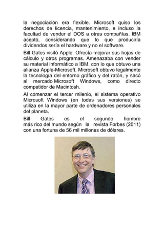 Bill Gates nació en 1955 y es el cofundador de Microsoft. Cursó estudios en la escuela privada Lakeside en Seattle, donde tuvo su primer contacto con las computadoras. En 1975 fundó Microsoft siendo aún estudiante en la Universidad de Harvard. Microsoft tuvo éxito al vender su sistema operativo MS-DOS a IBM en 1980 y luego sacar al mercado Windows como competidor de Macintosh de Apple. Actualmente, Windows es el sistema operativo más utilizado y Gates es la segunda persona más rica del mundo con una fortuna de 56 mil millones de dólares.