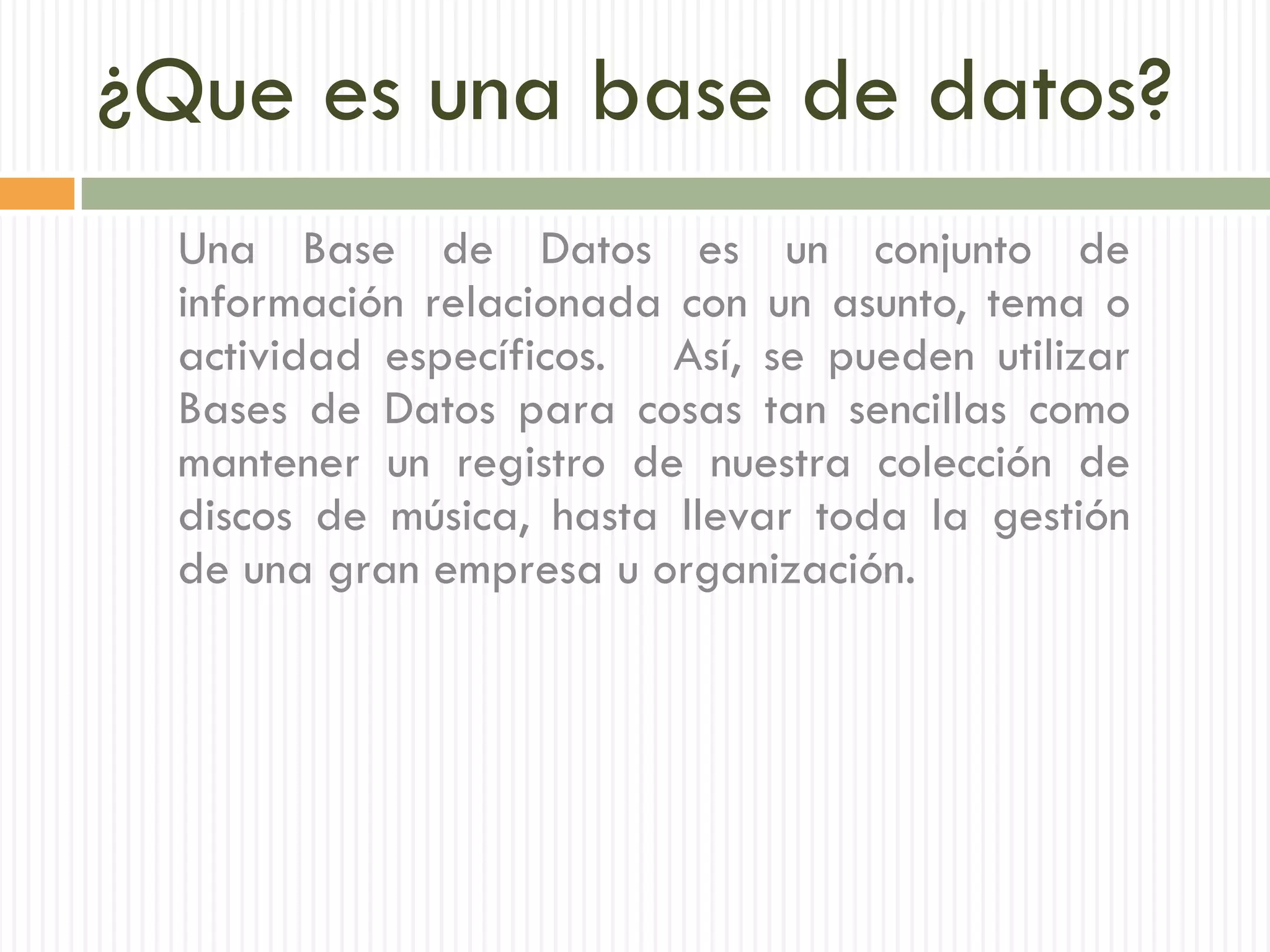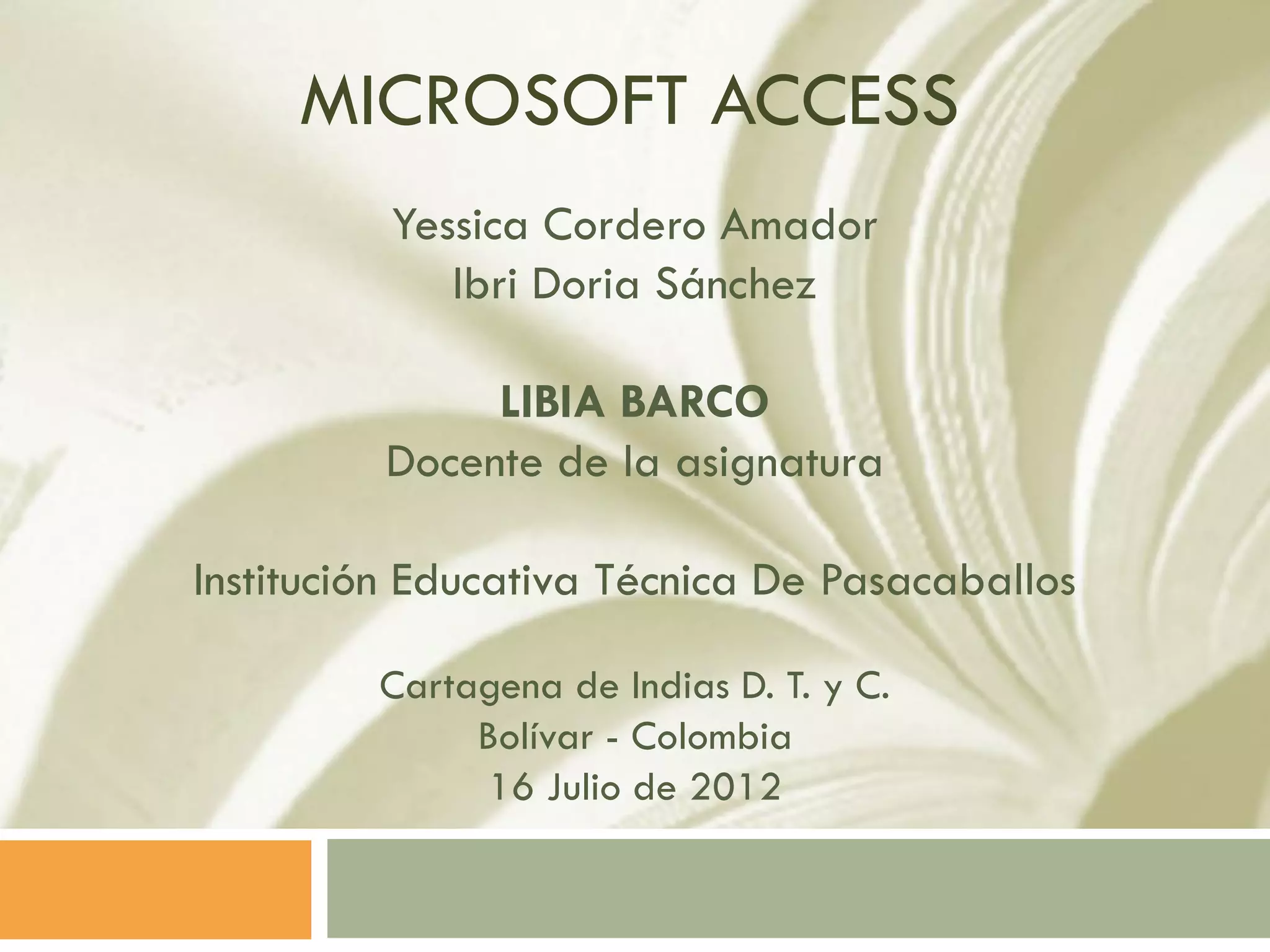 El documento proporciona información sobre Microsoft Access, incluyendo: 1) qué es una base de datos y qué es Access, 2) cómo crear una base de datos desde cero en Access, y 3) cómo buscar y aplicar plantillas preexistentes o abrir bases de datos existentes en Access.