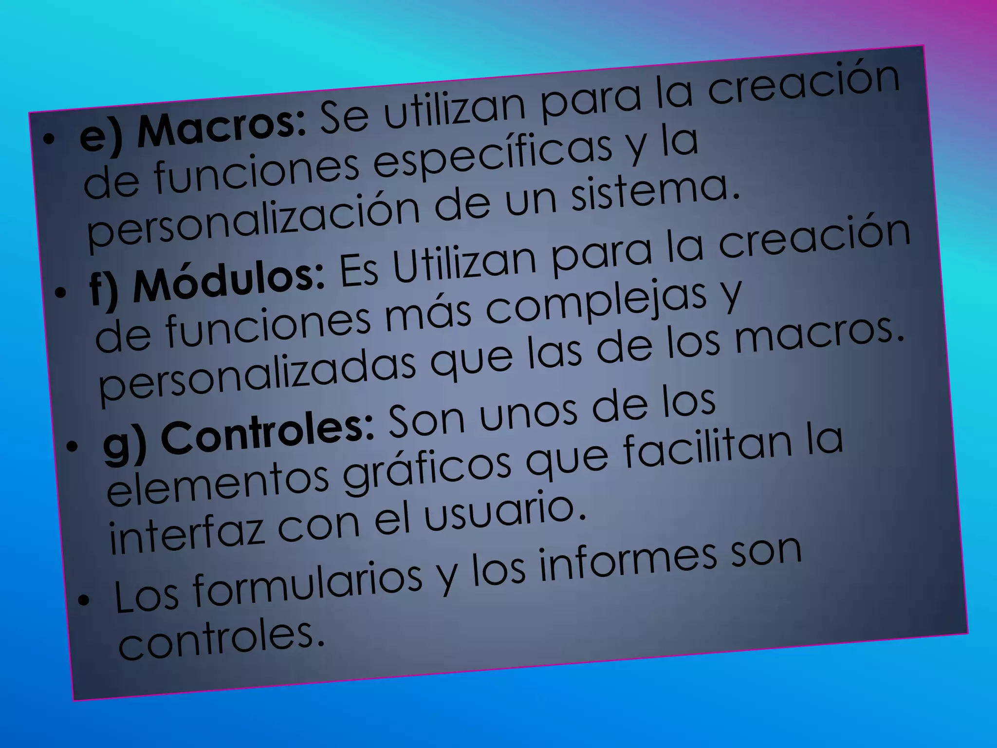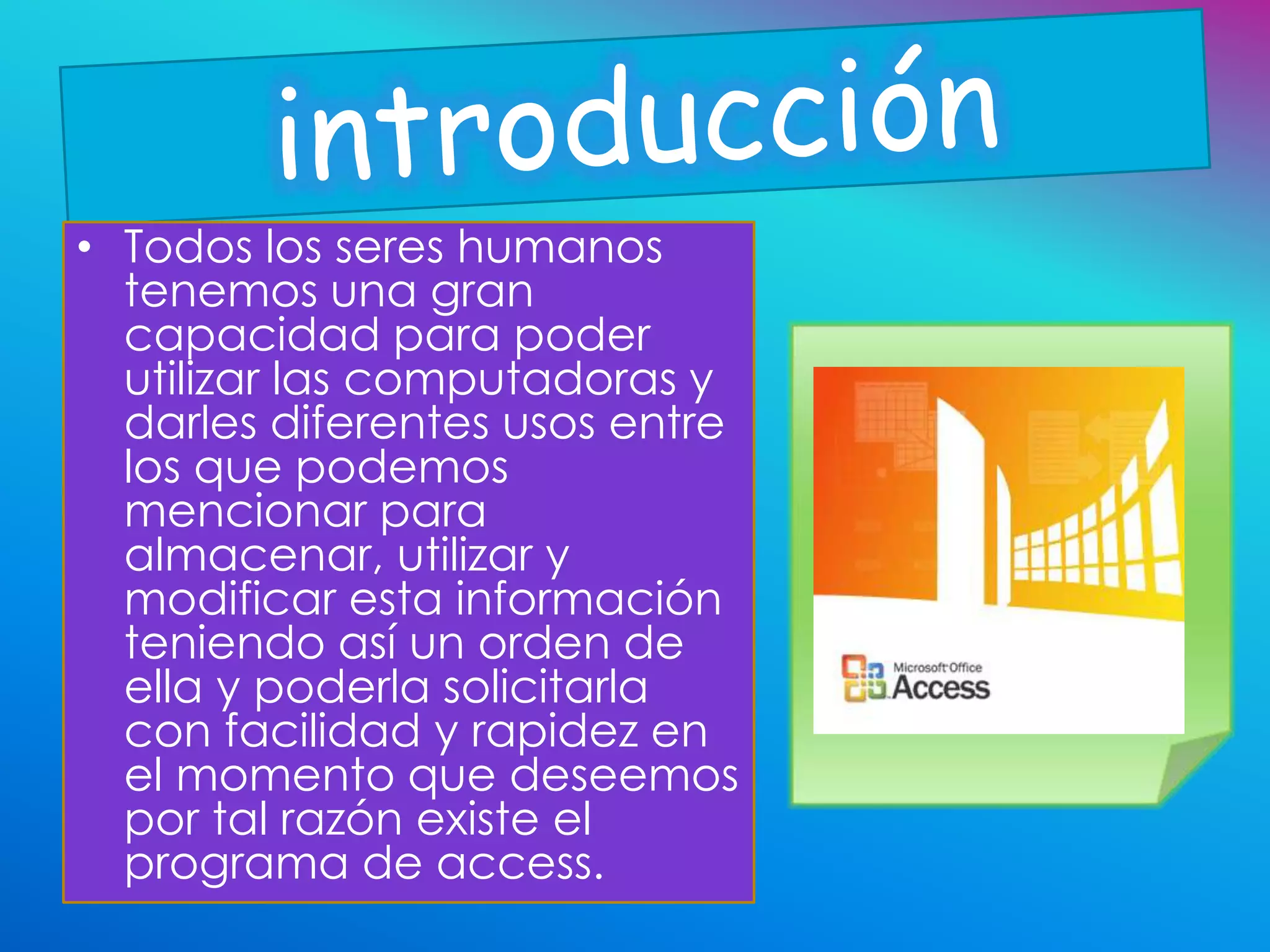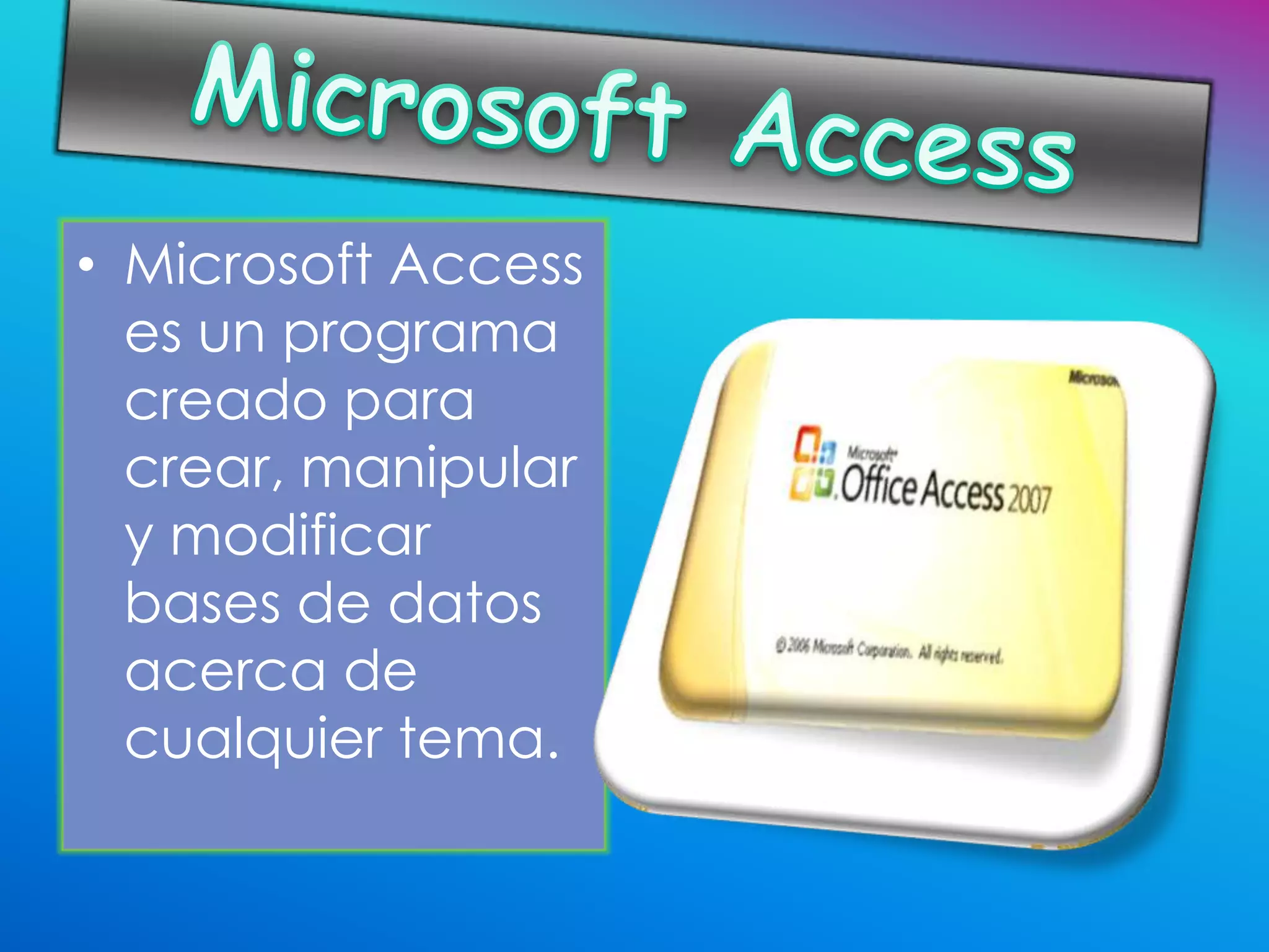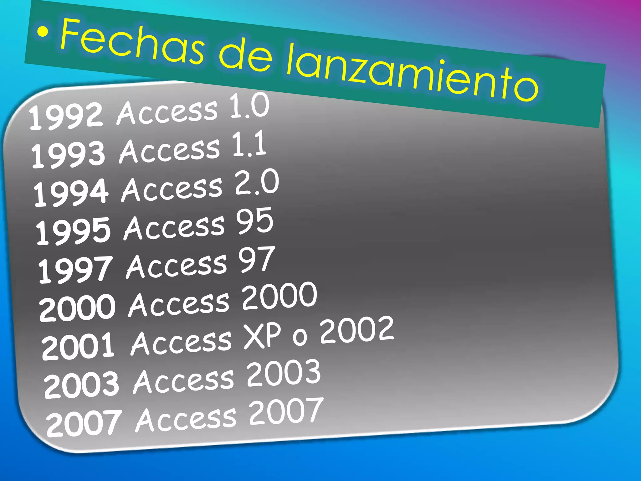 Microsoft Access es un programa diseñado para crear, manipular y modificar bases de datos, lanzado por primera vez en 1992. A lo largo de los años, ha evolucionado con nuevas versiones que mejoran la compatibilidad y funcionalidad, incluyendo la introducción de nuevos formatos de base de datos como accdb en Access 2007. Access se ha convertido en la principal herramienta de gestión de bases de datos para Windows, facilitando el manejo de grandes volúmenes de información.