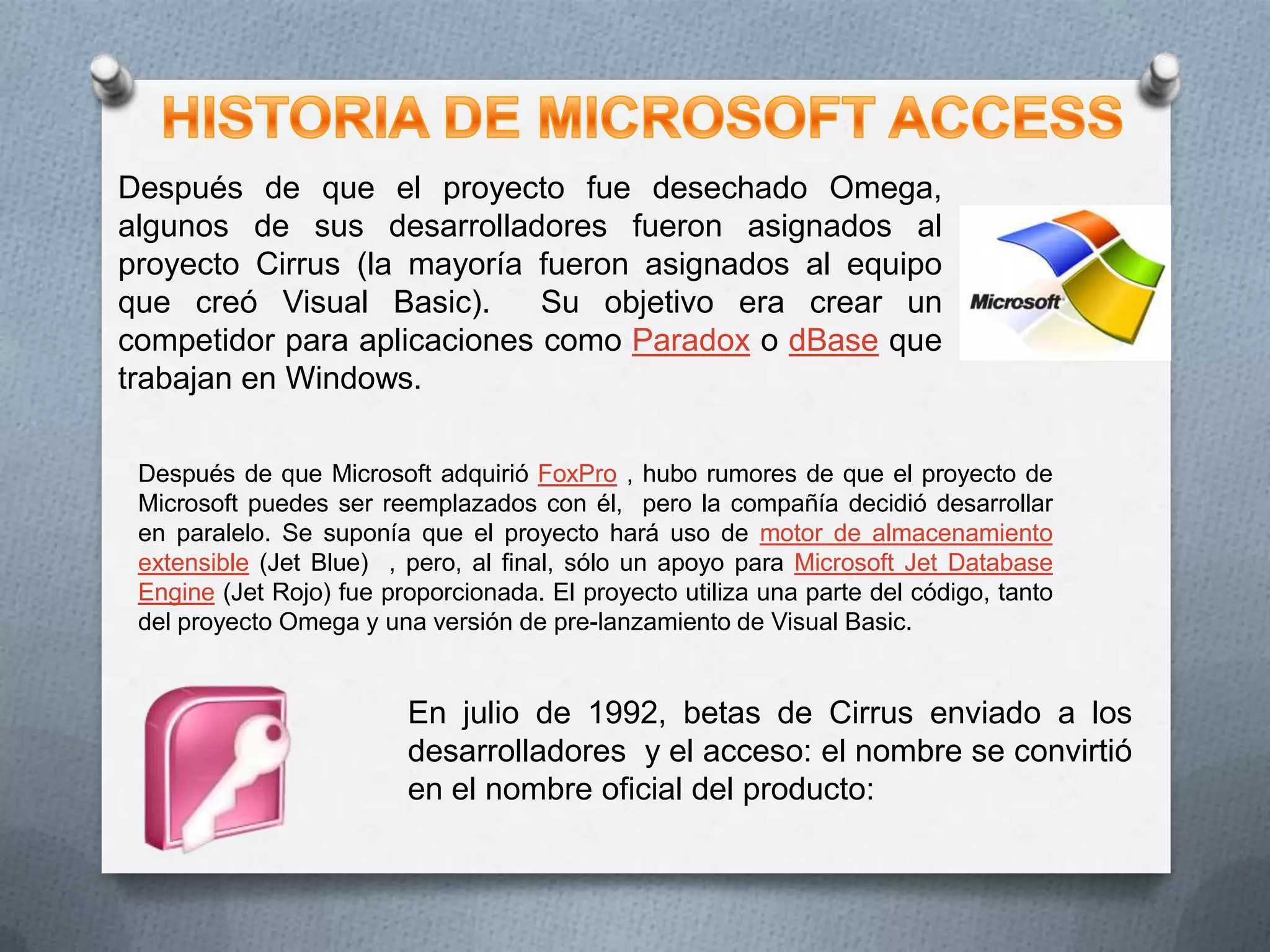El documento describe la historia y características principales de Microsoft Access. Comenzó como un proyecto llamado Cirrus en 1992 para crear un competidor de bases de datos para Windows. Desde entonces, ha pasado por varias versiones que han mejorado su facilidad de uso y funcionalidad, convirtiéndose en una de las bases de datos más populares para uso personal y de pequeñas empresas.