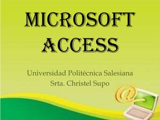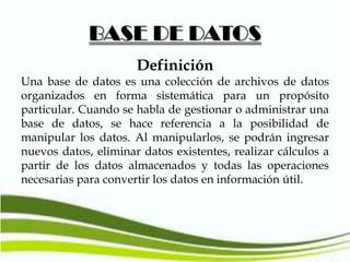 Este documento describe los conceptos fundamentales de las bases de datos en Microsoft Access, incluyendo tablas, consultas, formularios, informes, páginas, macros y módulos. Explica que una base de datos es una colección de datos organizados para un propósito particular y que puede manipularse mediante la inserción, eliminación y modificación de datos.