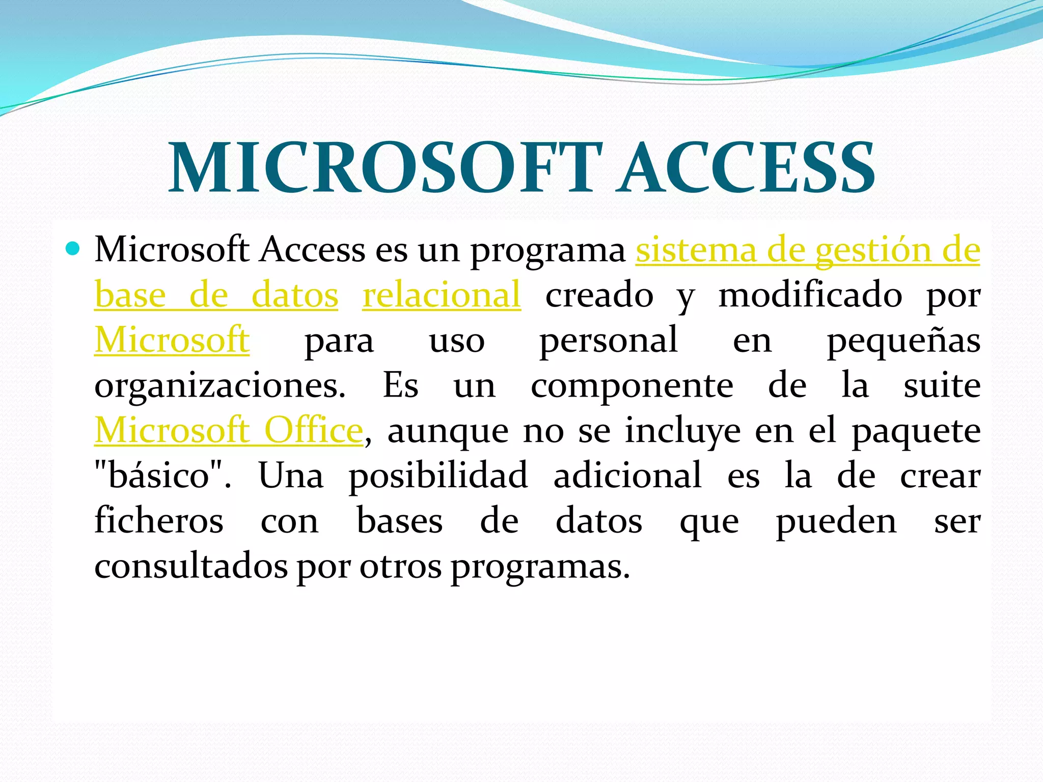 Microsoft Access es un programa de base de datos relacional creado por Microsoft que permite crear tablas, formularios, consultas, informes, macros y módulos para organizar y acceder a información de manera fácil. Access facilita la creación de bases de datos para pequeñas y medianas organizaciones a través de una interfaz gráfica que permite visualizar y modificar datos de manera sencilla.