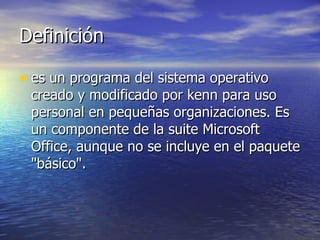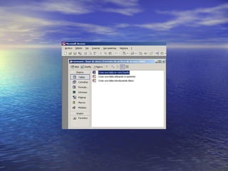 Microsoft Access es un programa de base de datos desarrollado por Microsoft para uso en pequeñas organizaciones. Permite manipular datos en tablas, realizar cálculos complejos y crear gráficos. La interfaz consta de una barra de títulos, menús, herramientas, estado y un área de trabajo.