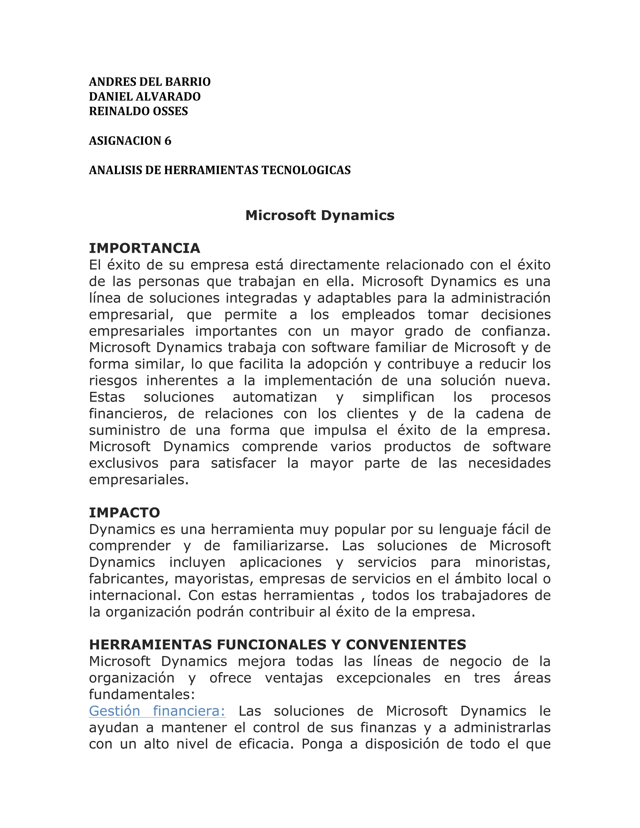 Este documento analiza dos herramientas tecnológicas: Microsoft Dynamics y Ultimus. Microsoft Dynamics es un conjunto de soluciones integradas para la administración empresarial que automatiza procesos financieros, de clientes y de la cadena de suministro. Ultimus es una plataforma de gestión de procesos de negocio centrada en Microsoft que ayuda a las empresas a modelar, automatizar y optimizar sus procesos. Ambas herramientas apoyan la estrategia empresarial al mejorar la productividad y permitir una toma de decisiones segura basada
