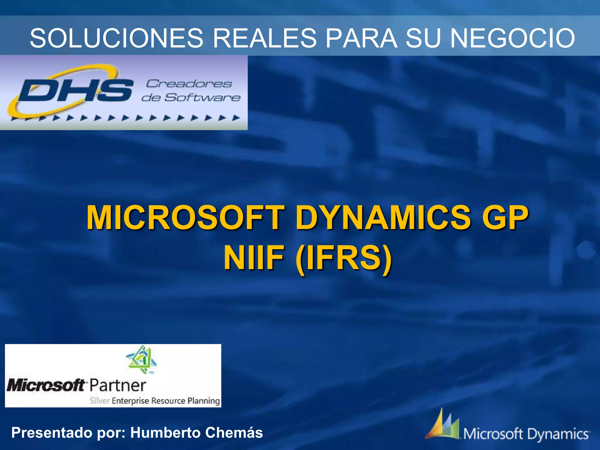 Dynamics GP proporciona varias funcionalidades para implementar Normas Internacionales de Información Financiera (NIIF). Estas incluyen la capacidad de mantener hasta tres libros contables (Base, NIIF, Local), direccionar transacciones a libros específicos, y extraer saldos de libros individuales o combinados. Los métodos clave para implementar NIIF incluyen duplicar la base de datos, crear un plan contable o segmento paralelo, o utilizar contabilidad analítica. Management Reporter y reportes de SQL Server ayudan a generar est