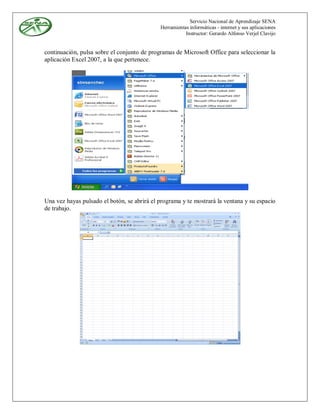 1. El documento presenta una introducción al software Microsoft Excel 2007, describiendo sus principales características y herramientas.
