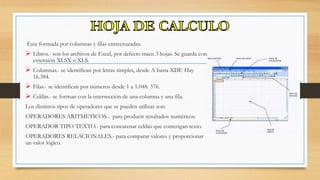 Este documento proporciona una introducción a Microsoft Excel, incluyendo cómo abrir el programa, la estructura básica de una hoja de cálculo con filas, columnas y celdas, y los tipos básicos de operaciones y funciones como suma, promedio, mínimo, máximo y concatenación.