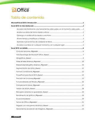 Este documento proporciona una introducción y resumen de las principales características de Microsoft Excel 2010. Excel 2010 ofrece nuevas y mejoradas herramientas para analizar y visualizar datos, lo que permite a los usuarios tomar mejores decisiones comerciales. También facilita la colaboración en línea y el acceso a los archivos desde cualquier lugar. Excel 2010 ayuda a los usuarios a completar tareas de una manera más fácil, rápida y flexible.