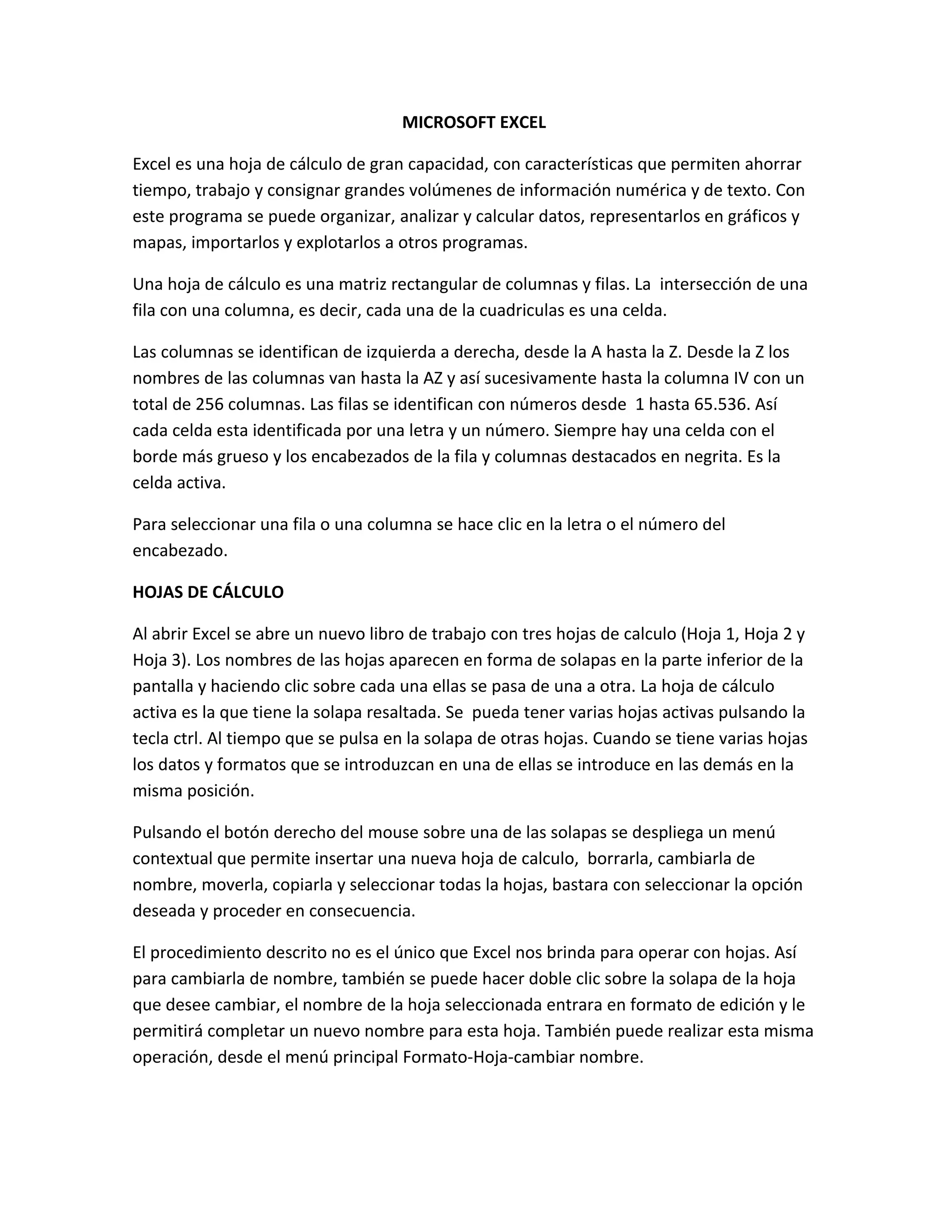 Excel es una hoja de cálculo poderosa que permite organizar, analizar y representar grandes volúmenes de datos numéricos e importarlos a otros programas. Está compuesta por celdas identificadas por letras de columnas y números de filas que forman hojas de cálculo donde se introducen y manipulan los datos. Excel también permite crear gráficas a partir de los datos para facilitar su comprensión.