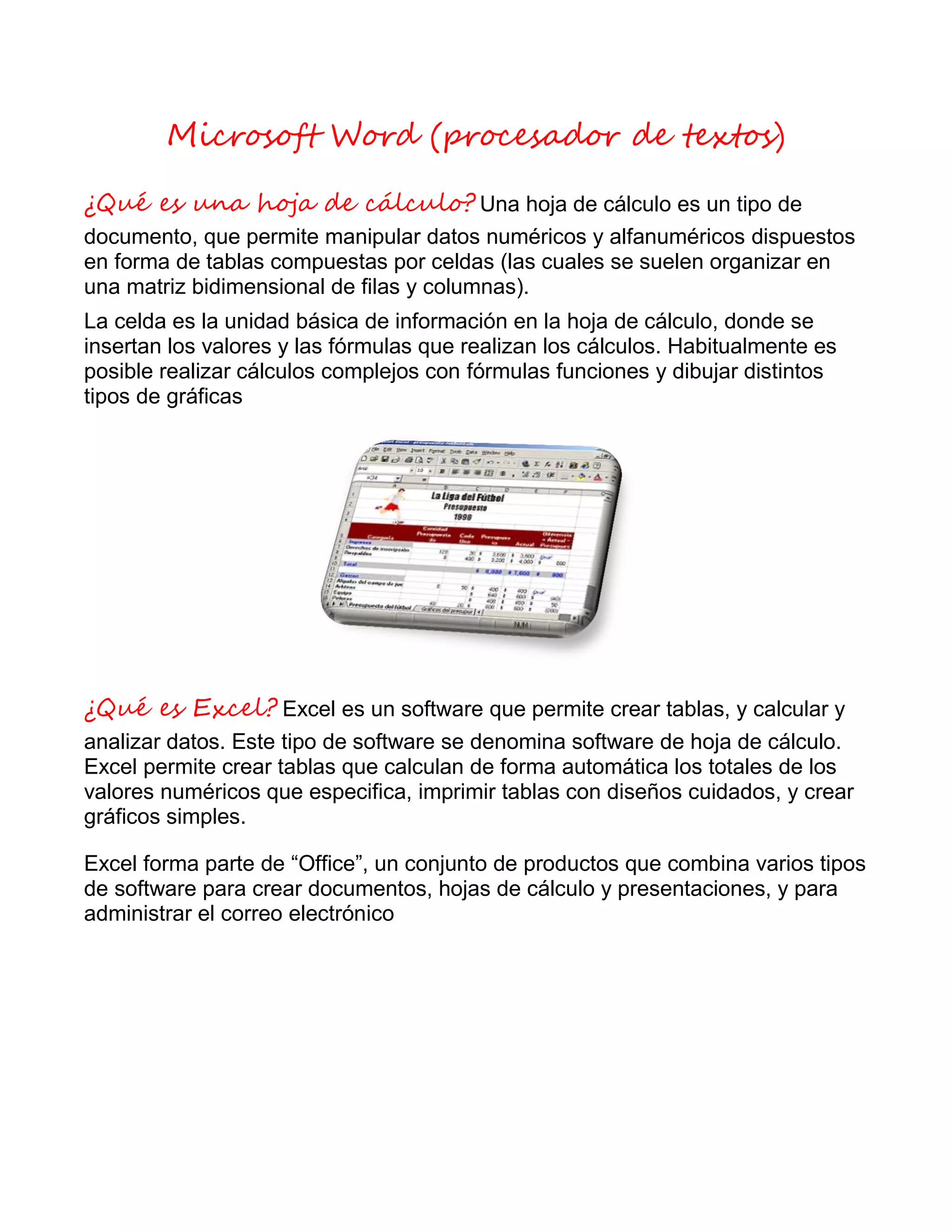 El documento describe lo que es una hoja de cálculo, que permite organizar y manipular datos numéricos y alfanuméricos en celdas dentro de una tabla. Excel es un software de hoja de cálculo que permite crear tablas, realizar cálculos automáticos, imprimir tablas y crear gráficos. Excel forma parte de Microsoft Office.