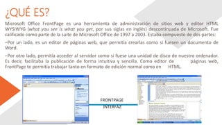 Microsoft FrontPage fue un editor de páginas web y herramienta de administración de sitios desarrollado originalmente por Vermeer Technologies y luego adquirido por Microsoft. FrontPage permitía crear y editar páginas web de forma intuitiva a través de una interfaz WYSIWYG sin necesidad de conocimientos avanzados de HTML. Aunque ya fue descontinuado, FrontPage fue durante mucho tiempo uno de los editores web más populares debido a su facilidad de uso.