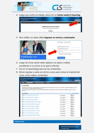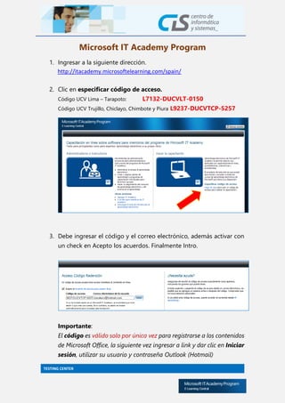 El documento proporciona instrucciones en 9 pasos para acceder a cursos gratuitos de Microsoft Office a través de la plataforma de aprendizaje en línea de la Academia de TI de Microsoft. Los pasos incluyen ingresar a la dirección web especificada, introducir un código de acceso único, iniciar sesión con una cuenta de correo electrónico, registrar los datos personales, acceder a los contenidos de los cursos y interactuar con los materiales de aprendizaje.