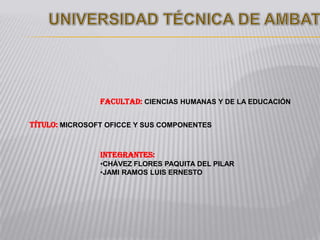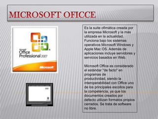 Microsoft Office es la suite de productividad más utilizada actualmente. Incluye programas como Microsoft Word, que permite crear documentos; Microsoft Excel, que es útil para tablas y contabilidad; y Microsoft PowerPoint, que se usa para presentaciones dinámicas. Cada programa tiene barras como menú, herramientas, presentación y desplazamiento para interactuar con los documentos.