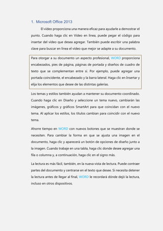El documento proporciona información sobre las diferentes aplicaciones de Microsoft Office 2013, incluyendo Microsoft Word 2013, Microsoft Excel 2013, Microsoft PowerPoint 2013, Microsoft Publisher 2013, Microsoft Visio 2013 y Microsoft Outlook 2013. Se describen brevemente las funciones principales de cada aplicación. También incluye gráficos sobre el uso de las diferentes aplicaciones de Office.