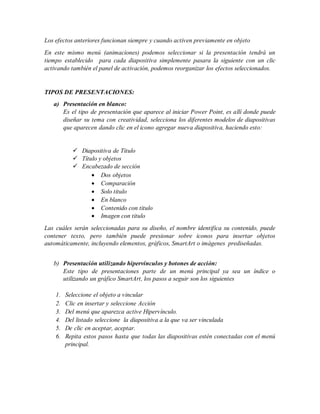 Este documento describe las funciones básicas de Microsoft PowerPoint para crear presentaciones, incluyendo cómo diseñar diapositivas, agregar animaciones, tipos de presentaciones, vistas de presentaciones y más. Explica conceptos como diapositivas, estilos de diapositivas, transiciones, menús de animación y cómo exportar una presentación a Microsoft Word.