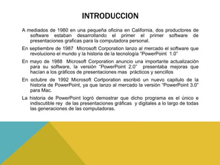 Dos productores de software desarrollaron el primer software de presentaciones gráficas para computadoras personales a mediados de los 1980. En 1987, Microsoft lanzó PowerPoint 1.0, revolucionando la tecnología. En 1988, PowerPoint 2.0 presentó mejoras que hicieron las presentaciones más prácticas y sencillas. En 1992, PowerPoint 3.0 se lanzó para Mac. PowerPoint ha demostrado ser el programa líder para presentaciones gráficas y digitales a través de las generaciones de computadoras.