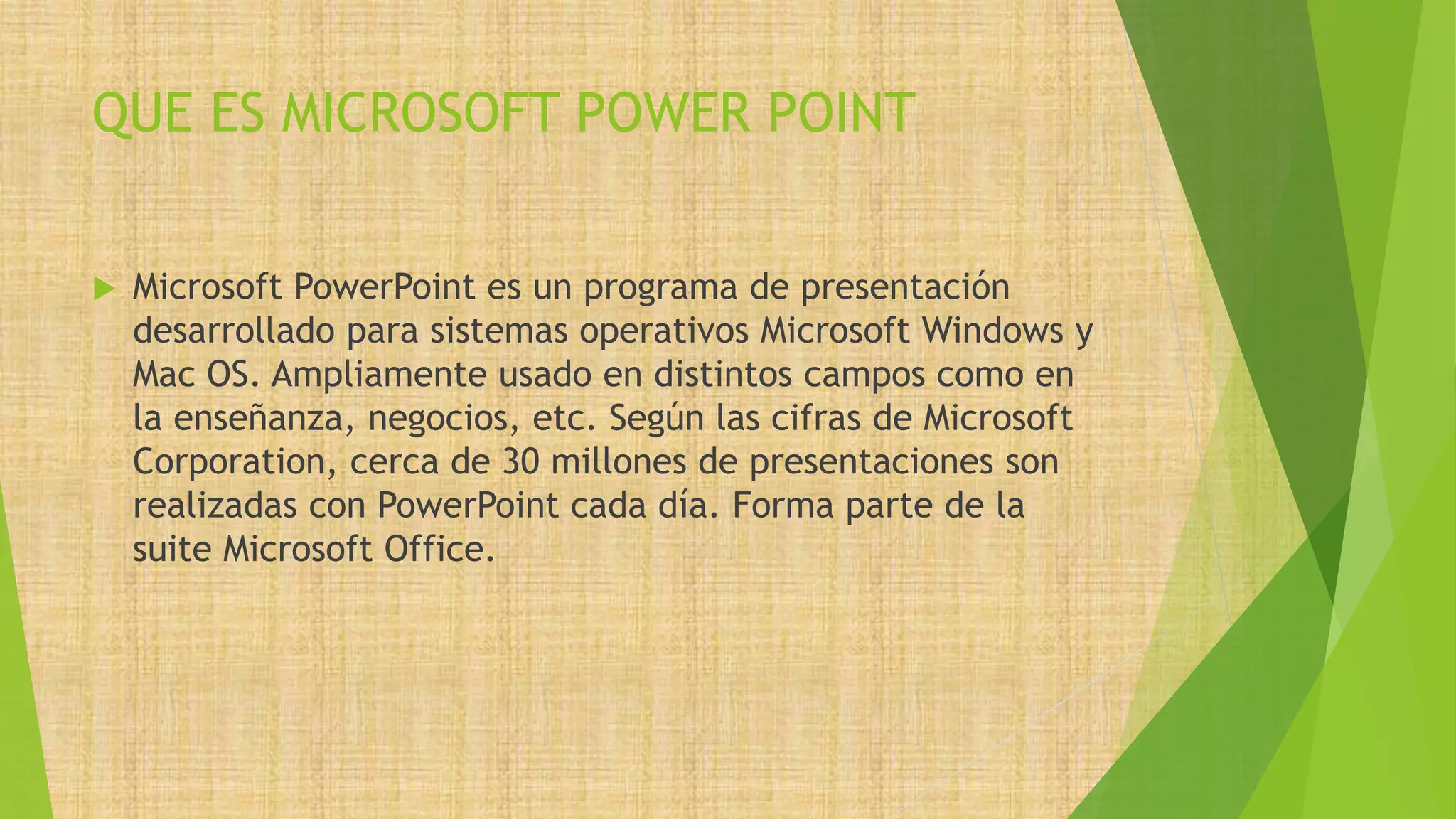 Este documento proporciona información sobre Microsoft PowerPoint. Explica que PowerPoint es un programa de presentaciones desarrollado por Microsoft que se usa comúnmente en la enseñanza y los negocios. Detalla algunos beneficios de PowerPoint como su capacidad para crear presentaciones con texto, imágenes y animaciones de manera fácil de entender. Además, explica los conceptos básicos de diapositivas, presentaciones y cómo crear y personalizar presentaciones en PowerPoint.