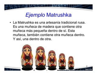 La recursividad es un concepto fundamental en programación orientada a objetos que permite que una función se llame a sí misma. Se compone de un caso base y un caso recursivo. Se ilustran ejemplos como el factorial y la serie de Fibonacci. Finalmente, se explica cómo resolver recursivamente el problema clásico de las Torres de Hanoi mediante la división en subproblemas.