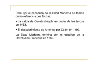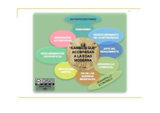 Este documento describe los principales cambios políticos, económicos, sociales y religiosos que ocurrieron durante la Edad Moderna en Europa, incluyendo el surgimiento de monarquías autoritarias, el desarrollo del capitalismo comercial, la Reforma Protestante liderada por Lutero y la Contrarreforma de la Iglesia Católica. También destaca el surgimiento del humanismo y su énfasis en la razón y la antigüedad clásica.