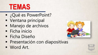Este documento presenta una introducción al software PowerPoint. Explica los componentes principales de la ventana principal como la barra de herramientas, panel de diapositivas y cinta de opciones. También describe cómo crear y manejar archivos, utilizar las fichas inicio y diseño, e insertar diapositivas y Word Art en una presentación.