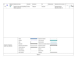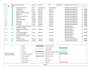 El documento presenta un cronograma diario que incluye 18 tareas como levantarse, ducharse, desayunar, ir al colegio, y esperar al profesor, con duraciones especificadas para cada una entre 1 minuto y 30 minutos. El cronograma se lleva a cabo el 19 de noviembre de 2012 y utiliza los recursos Darling Victoria Martinez Calle =D.