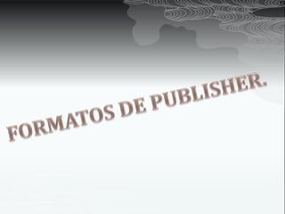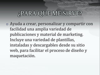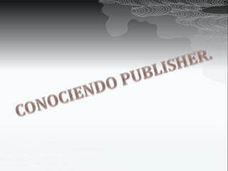 Este documento proporciona información sobre el programa Publisher y cómo usar sus diferentes funciones y plantillas. Explica que Publisher permite crear y personalizar publicaciones y material de marketing utilizando plantillas preinstaladas o descargables. Describe cómo encontrar el programa y algunas de sus plantillas principales como boletines, calendarios y folletos. Instruye sobre cómo importar documentos de Word, editar plantillas y publicar el trabajo final en formato PDF.