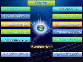 El documento describe la historia y características clave de varias versiones de Microsoft Windows, incluyendo Windows 1.0 de 1985, Windows 95 de 1995, Windows XP de 2001, Windows Vista de 2007 y Windows 8 de 2012. Cada versión presentó mejoras en la interfaz gráfica, compatibilidad con hardware, seguridad y otras funciones. El documento concluye que los sistemas operativos facilitan el uso y almacenamiento de archivos en una computadora.