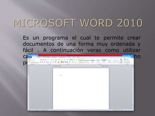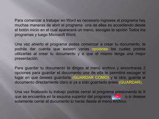 Este documento proporciona una introducción al programa Microsoft Word, explicando cómo abrir y cerrar documentos en Word, guardar documentos, y utilizar varias opciones y herramientas como formato, tablas, plantillas, páginas web, correspondencia combinada y tablas de contenido.