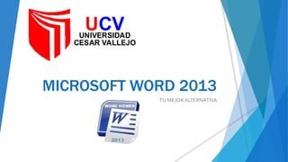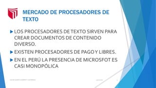 Microsoft Word 2013 es un procesador de texto que ofrece una interfaz visual y funcionalidades avanzadas como un nuevo modo de lectura, uso de estilos, diccionarios personalizados y automatización de procesos. Es el procesador dominante en el Perú y se actualiza según el sistema operativo Windows. Se comercializa en diferentes ediciones a precios que van desde S/. 189.99 a S/. 699.00 a través de distribuidores como Microsoft del Perú, Mercado Libre e Infor Data.