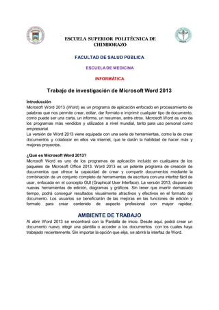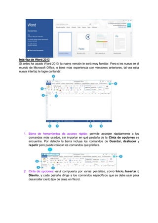 Este documento proporciona una introducción a Microsoft Word 2013, incluyendo una descripción de la interfaz, cómo crear y guardar documentos, agregar tabulaciones y sangrías, e insertar numeraciones y viñetas. Explica las principales características y herramientas de Word 2013 para editar documentos de manera efectiva.