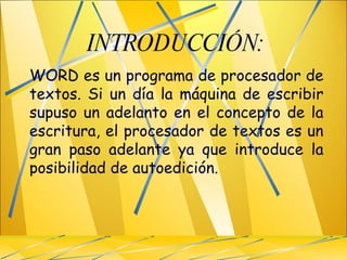 El documento proporciona una introducción al programa Microsoft Word, describiendo sus funciones básicas como la edición de texto y formato. Explica cómo abrir y guardar documentos de Word, y describe las diferentes barras y herramientas que permiten realizar tareas como cambiar fuentes, alinear párrafos, insertar tablas y numeración.