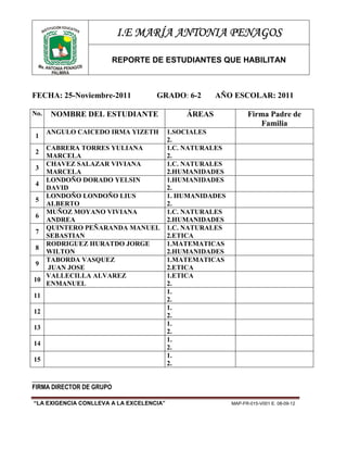 Este documento contiene cuatro reportes de estudiantes que habilitan diferentes áreas académicas en el grado 6 y 7 de la Institución Educativa María Antonia Penagos en Palmira. Los reportes incluyen el nombre de cada estudiante y las dos áreas que están habilitando para el año escolar 2011, así como la firma del director de grupo.