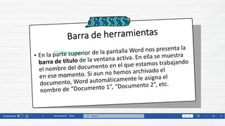El documento describe la evolución de los procesadores de texto desde máquinas de escribir hasta aplicaciones modernas como Microsoft Word, que permiten manipulación avanzada de texto y gráficos. También se mencionan las funciones básicas del programa, incluyendo edición y formato de texto, así como herramientas para manejar sangrías y listas. Además, se destacan características de la interfaz de Word y las diferentes barras de herramientas utilizadas para mejorar la productividad en la creación de documentos.