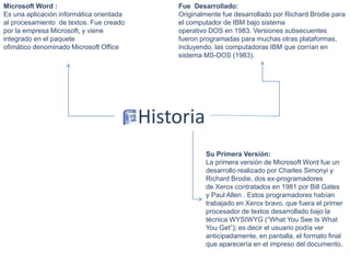 Microsoft Word es una aplicación para procesamiento de textos creada por Microsoft. Originalmente fue desarrollado en 1983 para computadoras con sistema operativo DOS. Ofrece herramientas como tablas, WordArt, corrección ortográfica y de movimiento de texto. Proporciona ventajas como facilitar la visualización y edición de textos con diferentes formatos y estilos.