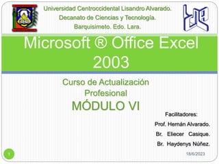 Este documento presenta un módulo sobre Microsoft Excel 2003. Incluye información sobre escenarios, su utilidad, cómo crear y administrar escenarios, y ejemplos de su uso. También cubre temas como resúmenes de escenarios, la herramienta Buscar Objetivo, y el uso del Solver para optimizar fórmulas. El módulo es impartido por tres profesores y contiene ejercicios prácticos sobre estos temas.