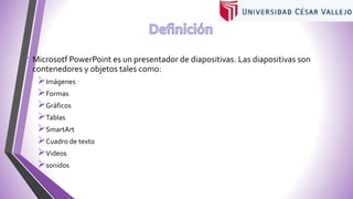 PowerPoint es un presentador de diapositivas que permite a los usuarios crear presentaciones utilizando varios objetos como imágenes, formas, gráficos, tablas, SmartArt, texto, videos y sonidos. Estos objetos pueden colocarse en diapositivas y contenedores con diferentes diseños para crear presentaciones efectivas.